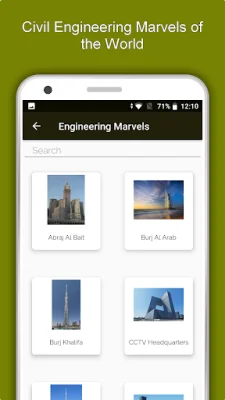 One of the main features of this app is the Engineering Marvels section, which showcases some of the most impressive civil engineering projects from around the world. Each marvel is accompanied by a detailed description and other interesting facts, providing users with a deeper understanding of these incredible structures.
