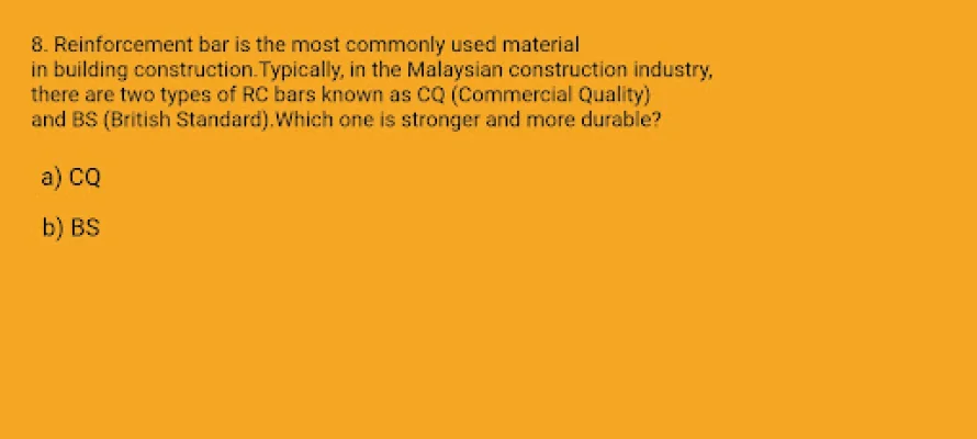 Civil Engineering Quiz Master is an application designed for individuals who are interested in testing their knowledge and skills in the field of civil engineering. It is suitable for both students preparing for exams and professionals looking to brush up on their understanding of concrete and cement technology, structural design, and construction materials. With its user-friendly interface and a variety of questions, this app is a great way to challenge yourself and have fun at the same time.