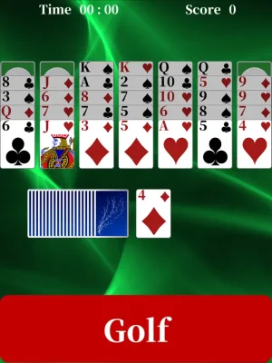Golf, the final game in this app, requires players to clear the board by tapping face-up cards that are either one above or one below the top card in the waste pile. Unlike the other games, players can put any card on the golf card.