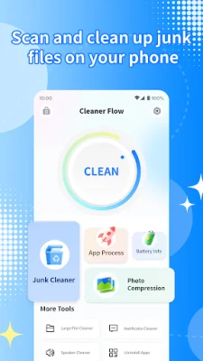 The key features of Cleaner Flow make it stand out from other cleaning applications. Its clean and simple design ensures an effortless cleaning experience. With just one tap, you can easily remove all the junk files from your device, freeing up valuable storage space. Additionally, you can also view your current battery level and monitor battery stats, helping you keep your device running smoothly.