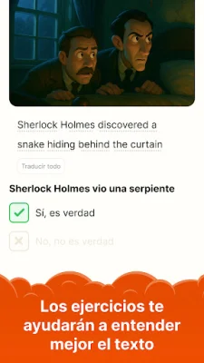 Además, la app cuenta con una traducción de frases completas, lo que te permitirá comprender el sentido de las palabras y seguir leyendo sin interrupciones. También podrás realizar ejercicios interactivos y juegos de vocabulario para practicar lo aprendido de manera casi imperceptible.