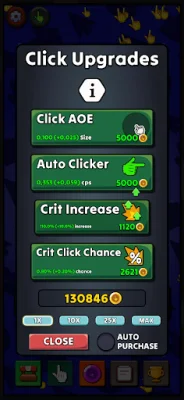 Clicker Clicker Clicker is a fun and addicting clicker game that will have you clicking away for hours on end. The main objective of the game is to click on the main cursor as much as possible, but there's a twist - golden falling cursors will also appear and reward you with even more click gold. The more you click, the faster these golden cursors will spawn, giving you the opportunity to earn even more rewards.