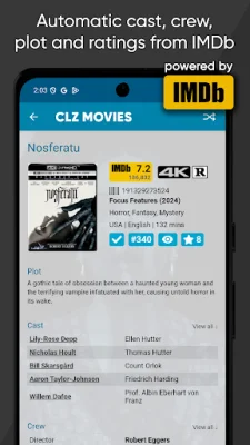 CLZ Movies is a movie manager app that has an official IMDb data license. It is a paid subscription app that costs $1.99 per month or $19.99 per year. However, users can try all of the app's features and online services for free with a 7-day trial. There are three easy ways to catalog movies on the app: scanning barcodes with the built-in camera scanner, searching by movie title, or searching by IMDb Number or IMDb URL. The app guarantees a 98% success rate with the barcode scanner. The app automatically provides full movie details from CLZ Core, including information from IMDb such as cast, crew, plot, episode lists, ratings, and votes. It also has its own Core movie database that includes cover art, trailer videos, and backdrop art. All movie formats are supported, from 4K UHD to VHS. Users can edit all automatically provided details from CLZ Core, as well as add their own personal details like location, ratings, and purchase information. The app also allows for the creation of multiple collections, which can be organized into folders by format, genre, or year. The app is fully customizable, allowing users to browse their film database as a list with small thumbnails or as cards with big images. They can also sort their movies in various ways and group them into folders. CLZ Cloud can be used to backup the movie database, sync it between multiple devices, and view and share the inventory online. The app also offers customer support 7 days a week. CLZ also offers other apps for organizing book collections, music collections, comic book collections, and video game collections. The company has been developing collection database software since 1996 and is based in Amsterdam, the Netherlands. Users have praised the app for its ease of use, fast support, and ability to keep track of large movie collections. It seamlessly syncs with other devices and has regular updates to keep the Core database up-to-date with new releases.