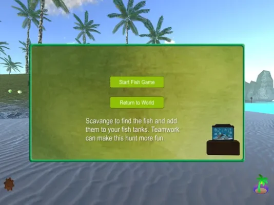 As you explore the island, you come across a fishing village where the fish are hiding. Your fish tank is empty, so your next task is to find and catch fish to fill it up. This becomes your next game to play.