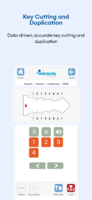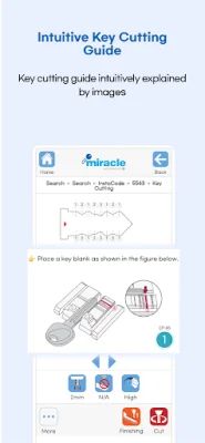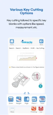 The MIRACLE™ key machine is a versatile and efficient application that offers a wide range of features for key cutting and duplication. It has an extensive key database that covers various types of keys, including car, motorbike, residential, and specialized keys. The key cutting process is simple and fast, and users can customize their cutting options to meet their specific needs. The app also allows for easy creation and management of personal key data, making it convenient for users to access their key information.