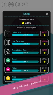 As you play and earn scores, you will receive coins that can be used to purchase upgrades at the shop screen. These upgrades can increase the line limit or strengthen the effects of special coins. Upgrade yourself and aim for a higher score!