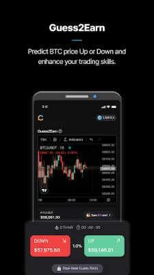 The Coinlive app is a platform that allows users to predict whether the price of Bitcoin will rise or fall by 1%. Users can also access price charts and see the predictions of other users through the 'Real-Time Guess Ratio' feature. The goal is to build a winning streak and become a G2E master.