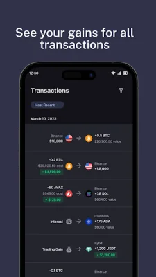 The app's key features include portfolio insights, where users can view detailed information about their crypto portfolio, such as all owned assets, average buy price for each token, unrealized gain/loss, total cost basis, and tax summaries. This feature also allows users to track their portfolio's performance over time and receive real-time updates during significant market movements.