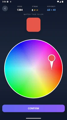 Color Match is a fun and challenging game that tests your ability to recreate a target color swatch using an RGB color wheel. The goal is to rotate the wheel to find the right hue, adjust the saturation and brightness, and confirm your choice to see how close you were to the target color. The game uses the professional industry standard of ΔE (Delta E) to score your accuracy, with a lower ΔE resulting in a higher score. The game also features strict thresholds and a streak system to keep you on your toes and improve your precision.