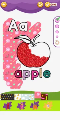 Do you love glitter and sparkles? Then you'll love this game! You can add glitter effects to your ABC letters and fruits, making them look even more dazzling. And with multiple color options to choose from, you can create a rainbow of colors on your coloring pages.