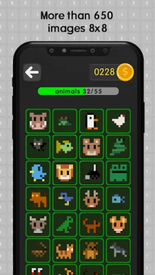 This application allows users to arrange blocks in a specific way to reveal a pixel art design. By completing each image, users can earn coins that can be used to help complete other drawings. With over 650 8x8 images to choose from, divided into 8 different categories, there is plenty of variety for users to explore and discover. The categories include Food, Heroes and Villains, Animals, Flags, Letters and Numbers, Emoticons, and Characters from Cartoons and Games. The application encourages users to be original and SEO oriented in their designs.