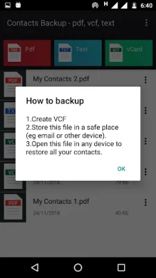 This application allows you to easily save your contacts in various file formats, including PDF, VCF, and text files. With the PDF option, you can create a traditional phonebook that is well-organized and can handle multiple contacts with ease. This is a great option for those who prefer a physical copy of their contacts or for those who want to have a backup in case their phone is lost or damaged.