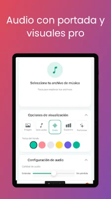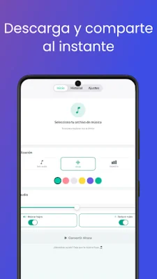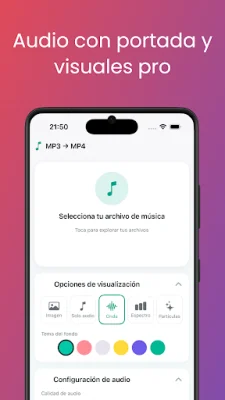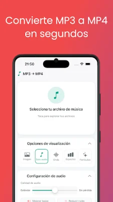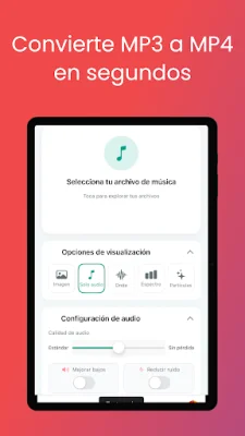 Convertir MP3 a MP4 es una aplicación que te permite transformar tus canciones favoritas en vídeos en tan solo unos segundos. Es perfecta para compartir en redes sociales, crear presentaciones o simplemente disfrutar de tu música con un toque visual. La aplicación cuenta con varias características principales, como la posibilidad de importar archivos MP3 directamente desde tu dispositivo, una conversión rápida sin perder calidad de audio, una interfaz intuitiva y fácil de usar, y la opción de guardar tus vídeos MP4 directamente en la galería de tu teléfono. Además, garantiza conservar la calidad original de tu audio. ¿Por qué elegir Convertir MP3 a MP4? Esta aplicación te permite subir tu música a plataformas que solo admiten formato de vídeo, crear felicitaciones o mensajes personalizados con música y un fondo de tu elección, y convertir canciones en vídeos para compartirlos en YouTube, Facebook, Instagram y otras plataformas. La privacidad y seguridad están garantizadas con esta aplicación, ya que todo el proceso se realiza en tu dispositivo y tus archivos nunca se suben a servidores externos. El funcionamiento es muy sencillo: solo tienes que elegir el archivo MP3 que deseas convertir, pulsar "Convertir" y guardar y compartir tu nuevo vídeo MP4. Algunos de los beneficios de usar esta aplicación incluyen la ausencia de restricciones en el número de conversiones, la falta de marcas de agua en los vídeos y la compatibilidad con la mayoría de dispositivos Android y diversas resoluciones de vídeo. Además, puedes disfrutar de conversiones rápidas, sencillas y gratuitas. Descarga Convertir MP3 a MP4 ahora mismo y dale vida a tu música en formato de vídeo.