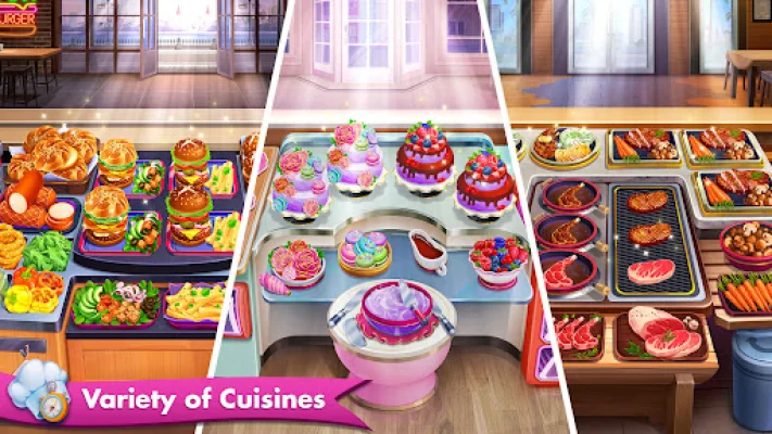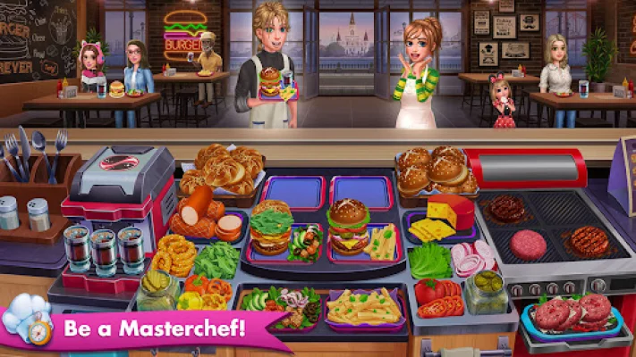 The game starts with Bayside Burgers, where you will grill raw patties to perfection and add fresh ingredients to create tasty burgers. As you unlock new cuisines and restaurants, you will be able to serve a variety of dishes such as cakes, steaks, ice, and more.