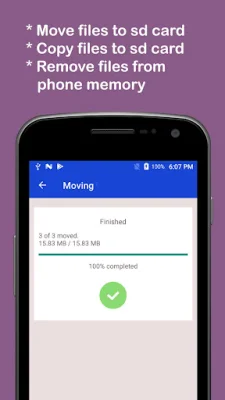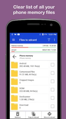 This application offers a quick and efficient solution for transferring files from your device's internal memory to an SD card. With just a few simple steps, you can easily move your files and free up space on your phone. Additionally, you can also copy files from your internal memory to the SD card with ease.