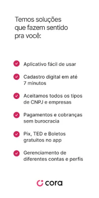 A Cora é uma sociedade de crédito direto e uma empresa de tecnologia, com CNPJs distintos. Seu objetivo é construir uma conta digital com recursos poderosos para simplificar a rotina dos empreendedores, permitindo que eles foquem no mais importante: o seu negócio. Em breve, a versão completa estará disponível para todos os usuários.