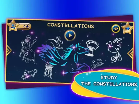 The Constellations section allows kids to match dots and create constellations in the starry sky. This is accompanied by a short story about the stars and constellations, adding a fun and educational element to the game.