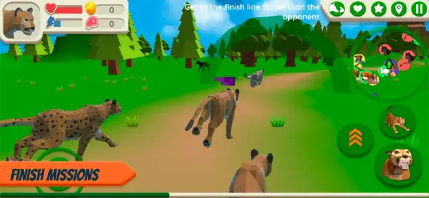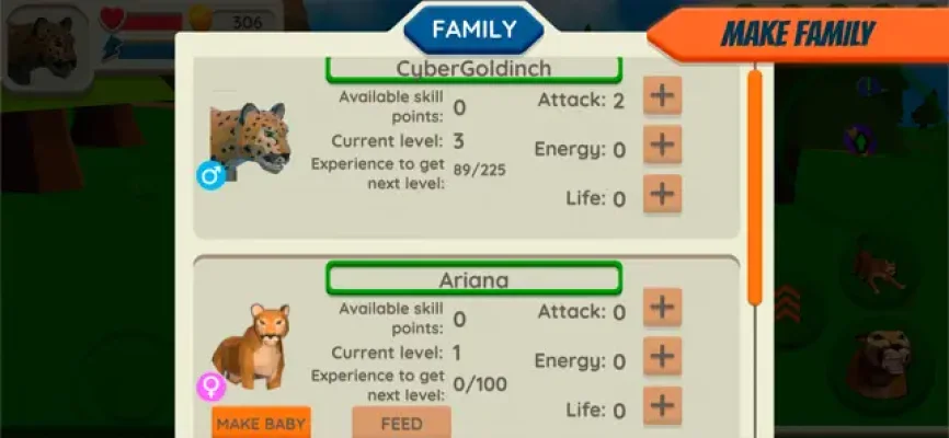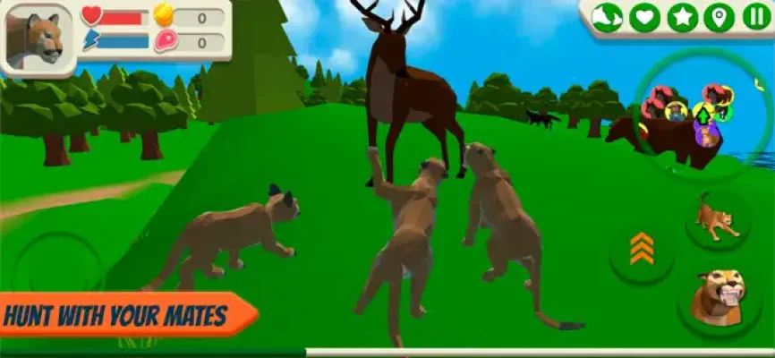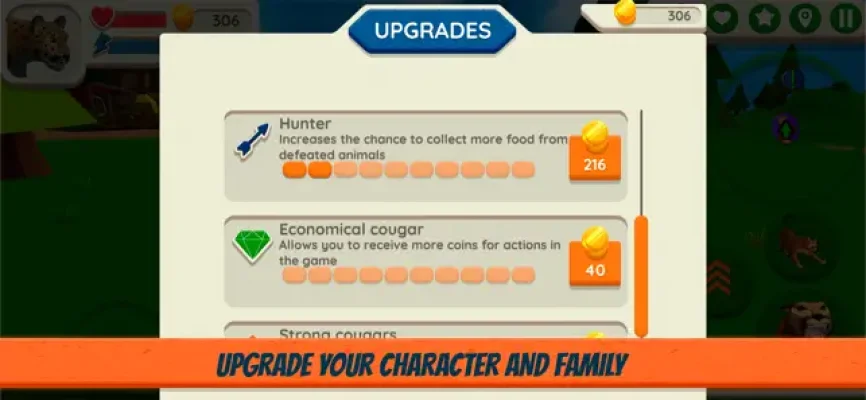 Once you have found another cougar, you can create a family and have babies. Your family can assist you in combat and hunting, and you can also improve their individual characteristics. To do so, you must hunt and collect food to feed your family and help them grow stronger. As you complete tasks and hunt, you can also improve your cougar's individual characteristics and skills, such as attack, energy, and life points.