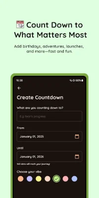 With Countdown by Dots, you don't just see how many days are left until your event, you feel it. Each dot represents a day closer to your special occasion, lighting your way and building excitement. This unique approach to tracking time adds a personal touch and makes the countdown experience more meaningful.
