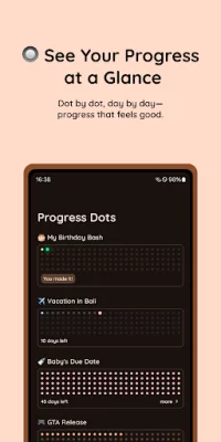 The application displays a line of dots for each event, with one dot representing each day leading up to the finish date. As the days pass, the dots fill up, providing a clean and satisfying way to visualize your progress through time. This feature not only helps you keep track of time, but also serves as a motivating tool to stay on track and reach your goals.