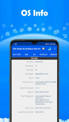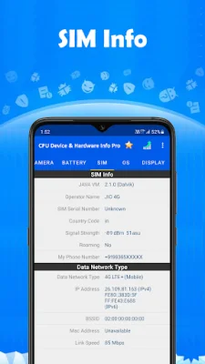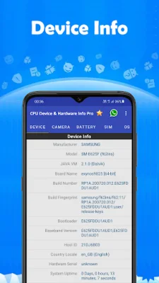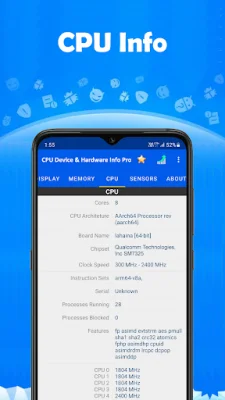 This application provides detailed information about your Android device, including its model, manufacturer, chipset, build number, and Android OS version. It also displays information about your device's system, such as CPU architecture, board, number of cores, clock speed, CPU features, governor, and kernel information. Additionally, it shows the current CPU utilization, total running processes, and clock frequency of each core.