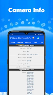 The app also provides information about your device's memory, including total and available RAM, as well as storage information. It also displays detailed information about your device's camera, including the primary and secondary camera, supported resolutions, focus modes, and anti-banding modes.
