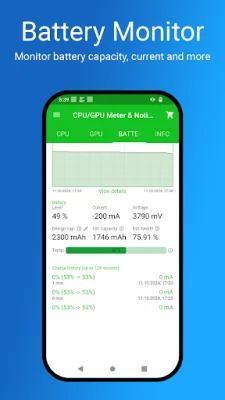 In addition to the real-time monitoring, the app also offers features such as monitoring battery capacity and charge/discharge rate, a charge alarm to notify you when the battery reaches a certain level, and the ability to customize which data is visible in the notification. The app also has a dark theme option and provides information about your device's hardware.