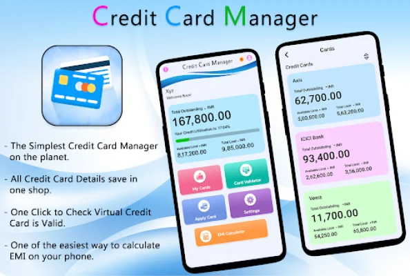 The Credit Card Manager app is a convenient and efficient tool for managing your credit card transactions and keeping track of your financial health. With its user-friendly interface and various features, this app is designed to make credit card management effortless. It allows you to monitor your spending, keep an eye on your available limit, outstanding balance, and credit utilization ratio, all in one place.