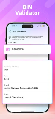 With the virtual credit card manager, you can instantly validate your credit cards with a tap. The app features a BIN checker that verifies credit, debit, and IBAN numbers, providing you with the details you need in seconds. This feature is perfect for checking for authenticity or confirming card details.