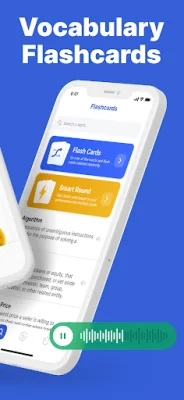 Other features of the app include feedback on correct and incorrect answers, customizable study reminders, and dark mode support. Users can also listen to pronunciations of glossary words.