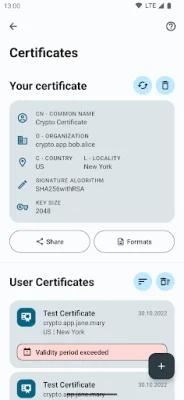 Other useful tools included in the app are a PEM decoder, RSA modulus converter, QR code generator and decoder, advanced base64 encoding/decoding, and a Bitcoin address generator. The secure communication tools section includes options for certificates, key exchange, signature, text encryption, and file encryption.