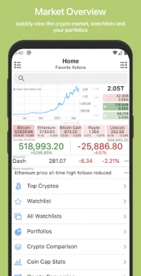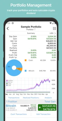 This application offers a comprehensive platform for tracking and managing over 1000 cryptocurrencies, including popular ones like Bitcoin, Ethereum, Ripple, and Litecoin. It also provides real-time quotes for these currencies, including market capitalization, open, day high, day low, 52-week high, 52-week low, and volume. Users can create multiple watchlists and portfolios to track their crypto transactions and see their portfolio account value, market value, cost basis, gain, and today's gain.