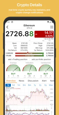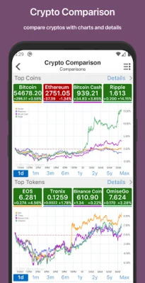 The app also features interactive and customizable native charts, allowing users to adjust the date range, background color, line width, chart interval, and type (line, candlestick, OHLC). They can also turn on or off chart indicators and use candlestick pattern recognition. Additionally, users can reply to crypto charts and export native charts as images.