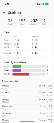 The app also includes smart features such as hints, error highlighting, auto-advance, letter frequency, and the ability to pause and resume puzzles. Players can track their progress and stats, including total puzzles solved, best and average scores, completion times by difficulty, daily streak, and recent activity. And the best part? There are no ads, making for a clean and uninterrupted puzzle-solving experience.