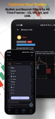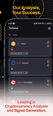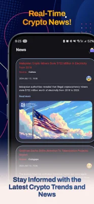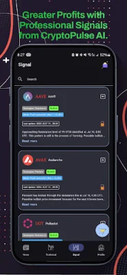With CryptoPulse AI, you can continuously analyze various cryptocurrencies in the market. The app offers key features such as a Technical Analysis Tab, where you can view the overall trend of a cryptocurrency at a glance, and a Signal Tab, where you can receive signals in different time frames and filter bullish or bearish signals. Additionally, the News Tab provides real-time updates on the latest news in the crypto world, with an AI system analyzing the sentiment of each news article.