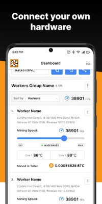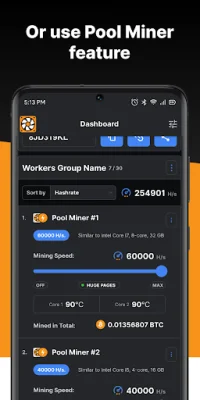 The Pool Miner feature allows you to start earning without installing mining software on your own PC. You can choose a preferred configuration, define a miner working period, and manage the process using the app's powerful dashboard. This makes it easy to earn a profit without any technical knowledge or experience.