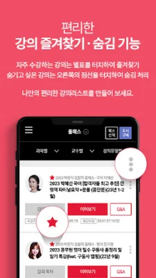 1. 나의 강의실: 강의를 즐겨찾기하거나 숨기는 등 나만의 편리한 강의 리스트를 구성할 수 있습니다. 또한 블루투스 키보드를 이용해 플레이어를 제어할 수 있으며, 여러 개의 강의를 한 번에 다운로드하거나 강의를 다운로드하면서 스트리밍할 수 있습니다. 강의자료와 영상을 한 화면에서 멀티로 학습할 수 있는 팝업 플레이어를 제공하며, 0.5~4배의 배속으로 학습할 수 있습니다. (※팝업 플레이어는 0.5 ~ 3배속)
