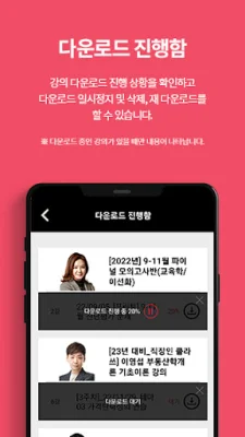 4. 다운로드 진행함: 강의 다운로드 진행 상황을 확인하고, 일시정지하거나 재 다운로드할 수 있습니다.