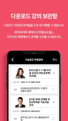 3. 다운로드 파일관리: 다운로드한 강의를 수강할 수 있으며, 원활하지 않은 인터넷 환경이나 Wi-Fi와 데이터가 연결되지 않은 오프라인 환경에서 유용합니다.