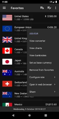 The app also offers interactive historical currency charts, ranging from the last day to the last decade. It also has a full catalogue of banknote images and integrates with Wikipedia and popular financial websites.