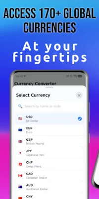 The app supports over 170 world currencies, including major currencies like USD, EUR, GBP, and JPY, as well as emerging market currencies and exotic monetary units. Users can easily find any currency by searching by name, currency code, or country.