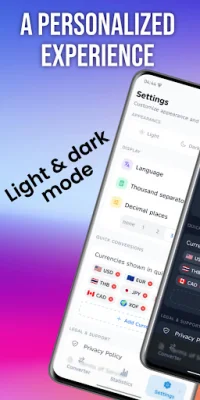 The app is also highly customizable, with options for dark mode, light mode, or auto mode, as well as the ability to adjust decimal places, toggle the thousand separator, set default currencies, and reorder the currency list via drag and drop. It also supports 20 different languages, making it accessible to users all over the world.