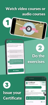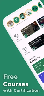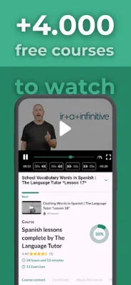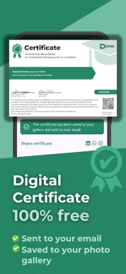 This application offers over 2200 free online courses in a variety of subjects, including information technology, languages, management and business, health, art and design, basic studies, instruments and vocal training, esthetics, and more. These courses can be accessed through videos, audio recordings, or text, and include exercises, discussion forums, and additional resources to aid in learning. Upon completion of a course, users will receive a digital certificate with a QR code for validation, which is automatically saved to their phone's photo gallery and sent to their email.
