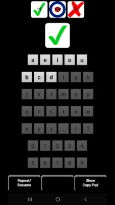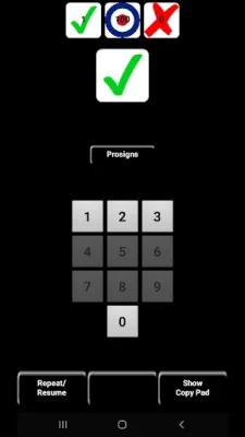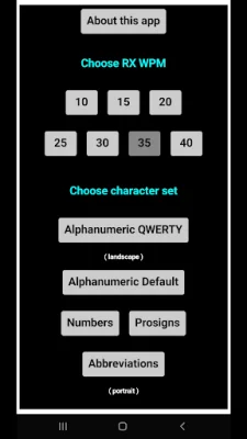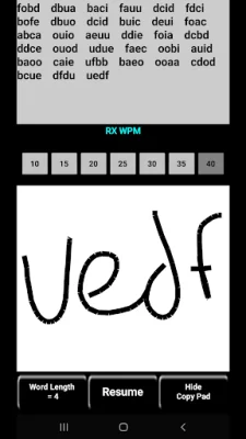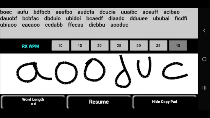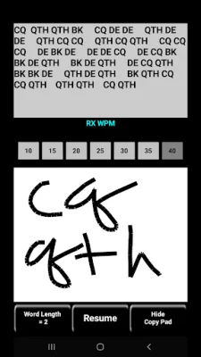 The Copy Pad interface allows users to receive a string of Morse code characters at various speeds and write them in the whitespace using their finger or stylus, or enter them via an external keyboard. The app provides a brief pause after each string for self-checking, and will compare the user's input to the given string for accuracy. Users can also adjust the word length and speed in this interface.