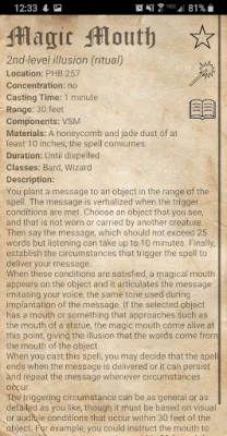 The app also provides all the necessary information about spellcasting, both general and class-specific, through the info button located in the top right corner. This makes it a valuable resource for players of all levels, from beginners to experienced players.