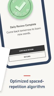 The app uses a Spaced-Repetition Algorithm to optimize the learning process. It introduces new words daily and shows previously reviewed words right before they are likely to be forgotten, ensuring they are stored in the user's long-term memory.
