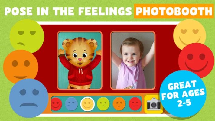The drawing easel provides children with paints, crayons, stickers, and more to express themselves creatively. They can save their artwork to the gallery or share it with friends and family. The feelings photo booth allows children to take pictures of themselves making different facial expressions and compare them to how Daniel looks when he feels the same way.