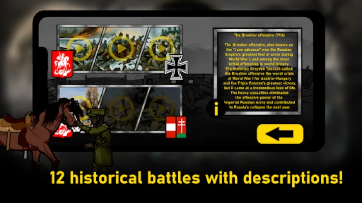 Engage in intense battles on the Western Front in this unique game with dark graphics. Immerse yourself in the historical setting of World War I and take command of six different armies: France, Germany, England, Austria-Hungary, Russia, and Italy. Each side has its own set of playing cards and soldiers, some of which are based on real troops and battles from the war. The game also features an encyclopedia that provides a deeper look into the events of World War I. Experience the realism of the units that fought in the trenches and relive famous battles from the Western, Eastern, and Italian fronts. Each army has its own distinct gameplay style, adding variety and challenge to the game. Utilize powerful weapons and war machines such as tanks, planes, and battle gas to gain the upper hand in battle. You can even call in natural disasters like blizzards, floods, and avalanches to bury your enemies. Earn medals by winning battles and unlock all the cards that will aid you in your quest for victory. With its focus on historical accuracy and unique gameplay, this game offers a fresh perspective on the Great War. Rewrite history and put your strategic skills to the test as you aim to be both original and SEO-oriented. So, gear up and get ready to engage in epic battles and make your mark on World War I.