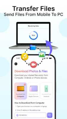 Data Transfer & File Sharing is a versatile and efficient app that allows you to quickly and securely transfer files and data between devices. It is designed to make mobile data transfer simple and fast, without the need for cables or complicated setup.