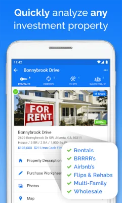 DealCheck is an all-in-one investor's toolkit, offering a wide range of tools and features to help you analyze and manage your real estate investments. You can use it to analyze single-family, multi-family, and commercial rentals, BRRRR's, Airbnb's, house flips, and wholesale deals. The app also allows you to import property descriptions, value and rent estimates, tax assessments, and photos from public records and listings.
